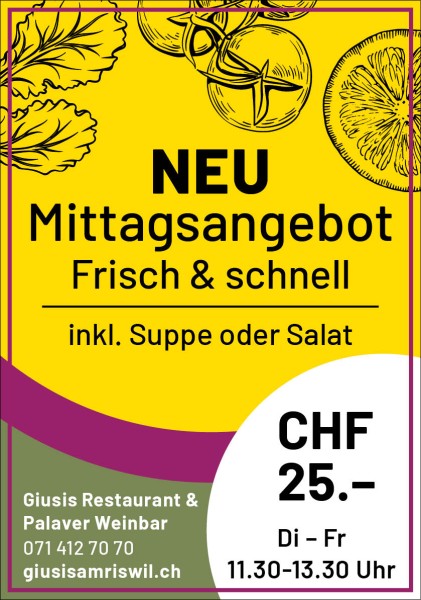 Geniessen Sie frisch zubereitete Vegi-, Fleisch-, Fisch- oder Burger-Gerichte, inklusive Suppe oder Salat – alles für CHF 25.–.